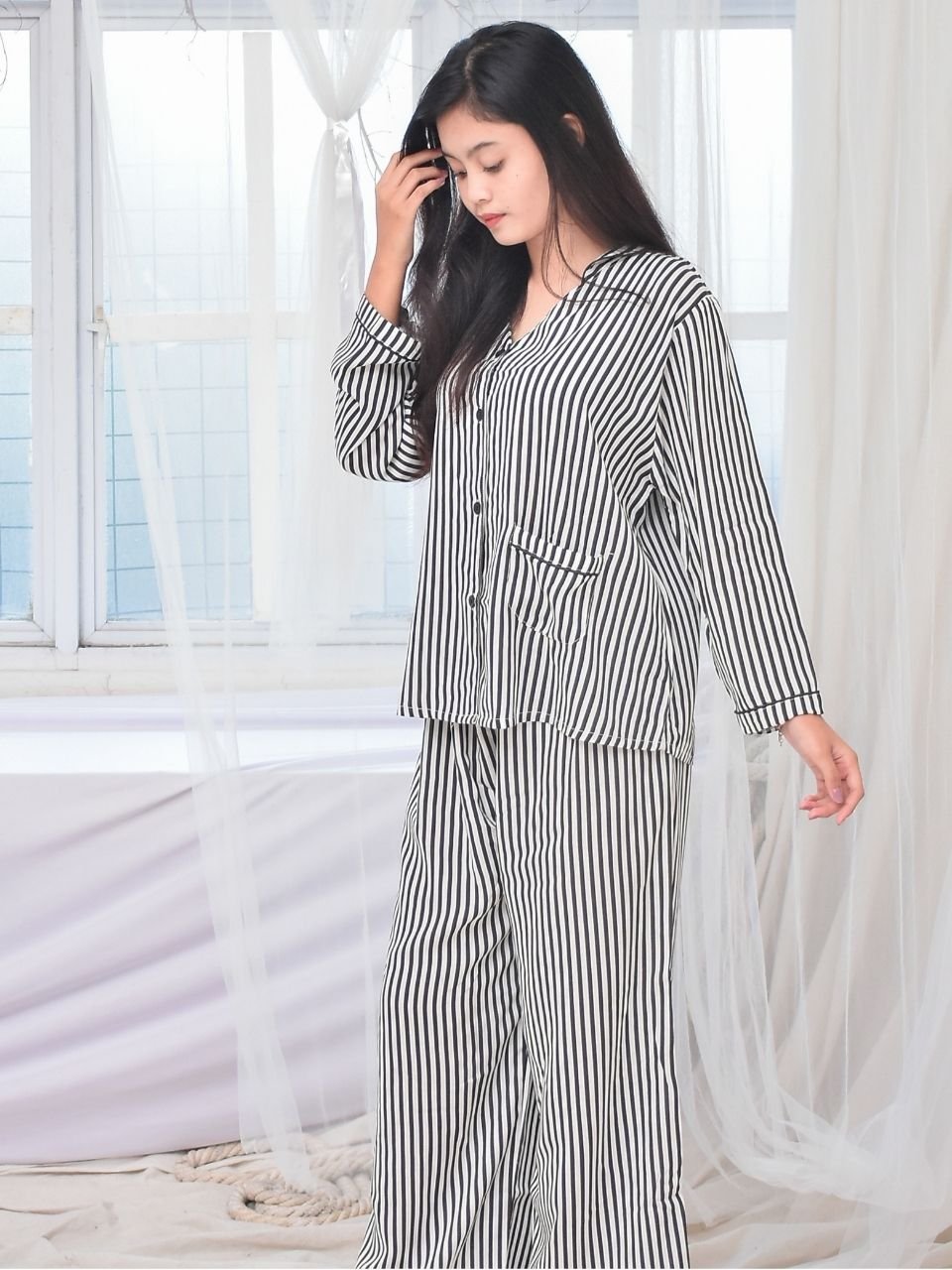 Polia Long Pajamas menghadirkan kenyamanan dalam desain panjang yang elegan dan minimalis. Motif garis klasik memberikan tampilan yang timeless dan mudah digunakan untuk berbagai suasana santai di rumah.
